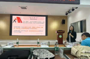 学校首席导师黄敏老师以《趣启课堂方寸智引成长之路——关于“共创”课堂的活动设计》为主题开展专题分享。作为学校“共创”工作室主持人,她系统阐释共创课“具有辅导特征的活动型德育课程”的定位,介绍了共创课堂教学设计五环节——“暖身导入—情境活动—体验分享—总结反思—延伸拓展”,及如何在共创课堂教学中设计具有可操作性的和高效性的活动,为参训教师投身“共创”课程教学提供了有力指导。