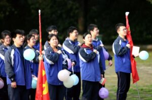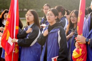 上午7:38分,升旗广场上,各班队列整齐,精神抖擞。在饶文奇老师的主持下,出征仪式在欢快的“听五拍肩”暖场活动中拉开序幕。同学们随着旋律互动,现场气氛热烈而有序。